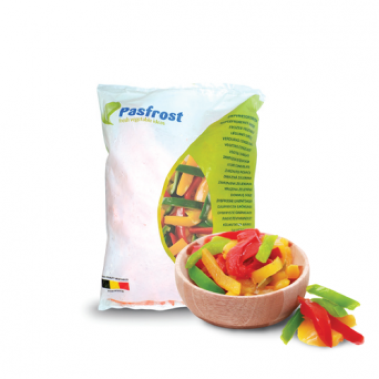 Campuran paprika (merah, hijau dan kuning) beku dengan potongan memanjang.