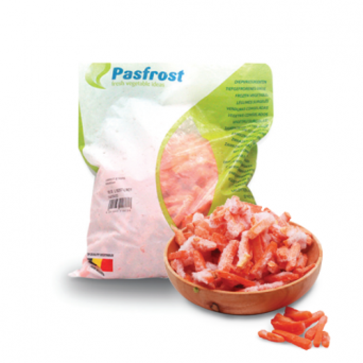 Campuran paprika (merah, hijau dan kuning) beku dengan potongan memanjang.