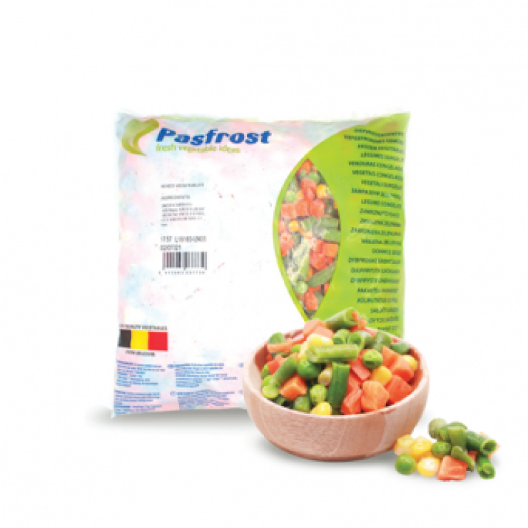 Potongan sayuran beku (Belgium) dengan komposisi wortel (dadu 10x10mm) 35%, kacang polong 25%, buncis 20%, jagung 20%. Sayuran cukup diblanch dan langsung siap dipakai. Petunjuk Pemakaian: Keluarkan sayuran dari lemari es/pendingin lalu rebus sebentar (1-2 menit) lalu dapat langsung digunakan