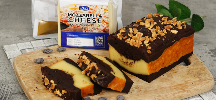 Tuang setengah adonan brownies pada Loyang lalu toping dengan adonan mozzarella dan tutup kembali dengan setengah bagian adonan brownies
