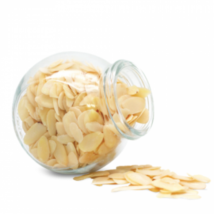 Almond California dalam bentuk potongan pipih yang diproduksi hanya dari almond berkualitas dan diproses sesuai standar GMP (good manufacturing practices), bebas dari kontiminasi rasa dan bau asing.