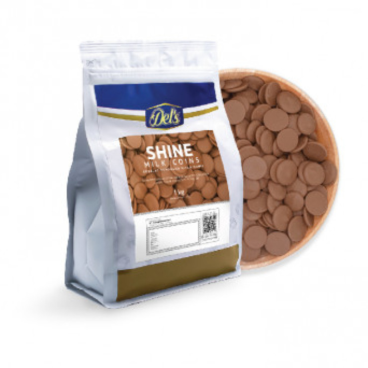 Coklat susu berbentuk koin dengan kandungan 10% susu bubuk dan 4% bubuk kakao.
