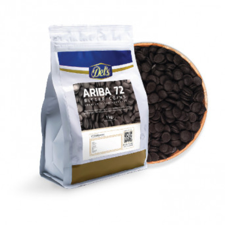 Dark Chocolate dalam bentuk koin tersedia dalam beberapa varian cocoa content. Varian: 72%.